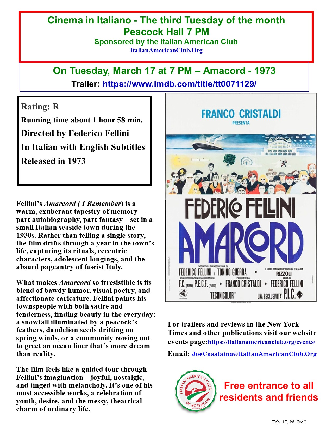 Cinema in Italiano – Peacock Hall- Amarcord – 1973